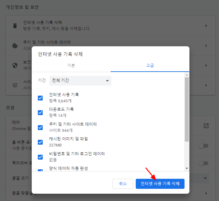 6. 인터넷 사용 기록 삭제를 알맞게 삭제를 해 주면 된다.
