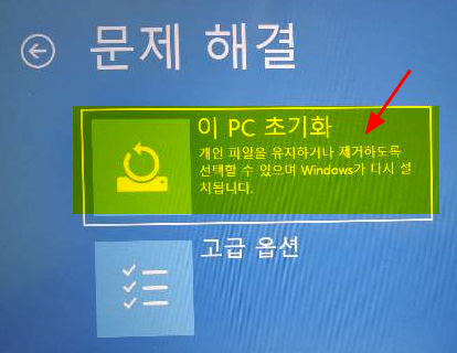 이 PC 초기화 / 고급 옵션이 다시 나온다.