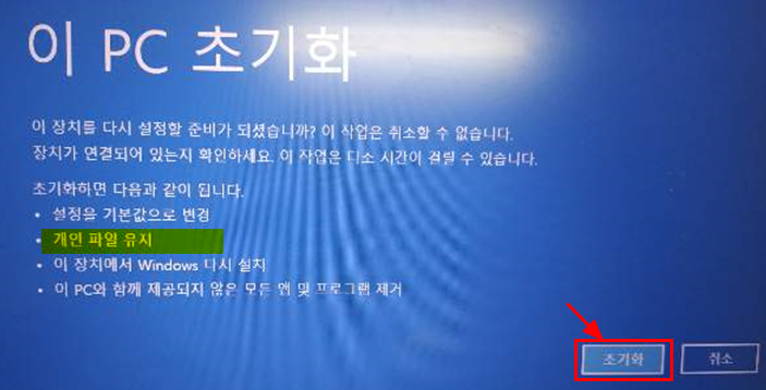 초기화 하면 시작되는 줄 알았는데.. 또 묻는 창이 뜬다. 개인 파일 유지인데 완전 윈도우를 새로 설치해서 자료가 다 날라가는 것은 아닌가 의심이 들었다.