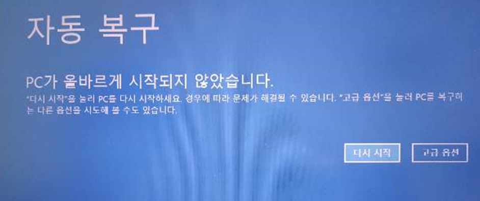[다시 시작], [고급 옵션] 중에 다시 시작을 누르면 계속 무한 자동 복구 화면으로 다시 돌아온다.