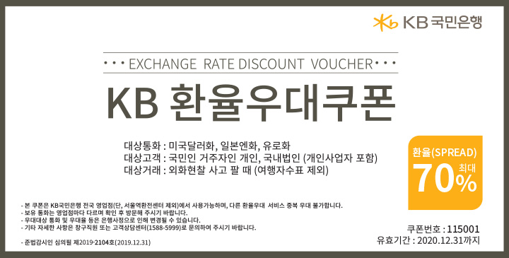 1. KB환율우대쿠폰 70% : 2020년 12월 31일까지