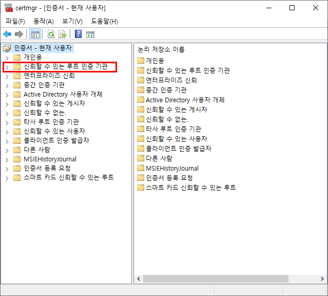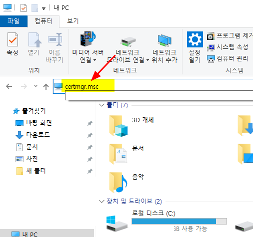 아무 폴더를 하나 열고 주소줄에 certmgr.msc입력하고 엔터를 쳐 보자.