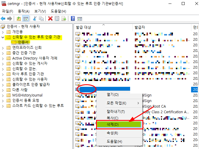 4. 삭제하려는 인증서를 찾아서 그 이름 위에 오른쪽 마우스 클릭 -> 삭제 를 선택하고 y를 누르면 삭제가 된다.