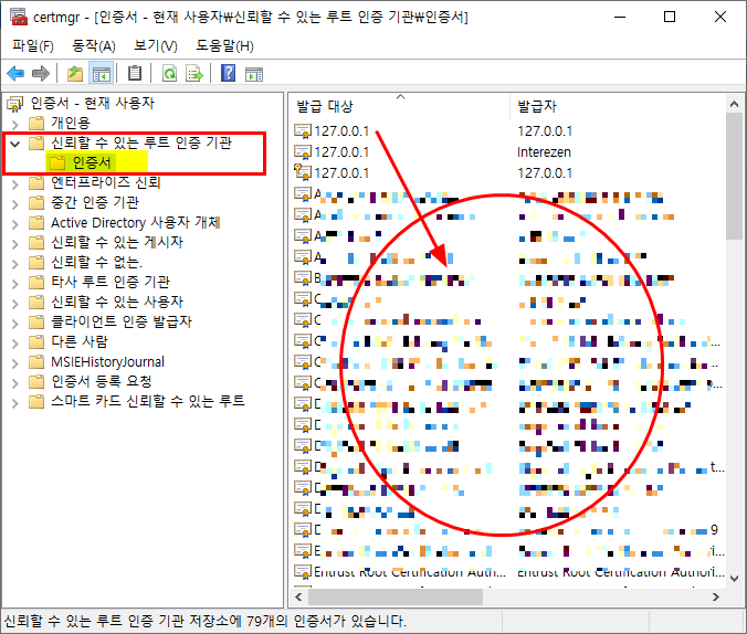 이럴 경우 때로는 루트 인증서(신뢰할 수 있는 루트 인증 기관)의 삭제가 필요한 경우가 생겼다.