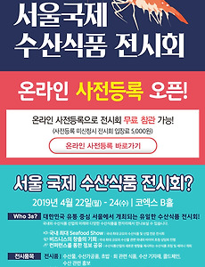 2019년 서울국제수산식품전시회 소식이 들려온다.대한민국 유통 중심 서울에서 개최되는 유일한 수산식품 전시회로 국내외 수산식품 산업의 미래와 다양한 수산식품을 한자리에서 볼 수 있다. 온라인 사전등록시 전시회 무료 참관 가능(미등록시 입장료 5,000원) 2019 서울국제수산식품전시회 4/22~24일 [ 온라인 사전 등록 바로가기 ]- 2019년 4월 22일~24일까지 코엑스 B홀- 국내 최대 seafood show- 비즈니스의 창출의 기회 (국내외 바이어 초청 상담회 진행)- 컨퍼런스를 통한 정보 공유(수산식품 포럼 및 세미나 개최) * 전시품목수산물 : 어패류, 선어, 수입 수산물수산 가공품 : 냉장·냉동품, 조미가공품, 염장식품, 건조식품, 구이제품, 어묵·해조류, 씨푸드 스낵, 통조림초밥·회 관련..