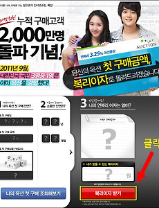 옥션(www.auction.co.kr)에서 누적 구매고객 2,000만명 돌파기념으로 이머니를 최대 2,000원까지 준다. 옥션을 처음 가입해서 첫구매금액을 복리이자 개념으로 환급해 주는데, 최대 2,000원까지 준다고 한다. [ 옥션 첫구매금액 복리이자 최대 2,000원 이머니 받기 - 이미지 출처 : 옥션 ] [ 옥션 첫구매금액 복리이자 최대 2,000원 받기 바로가기 ] 로그인을 한 뒤, 이벤트 페이지에서 [복리이자 받기]를 클릭하면 바로 확인이 가능하다. - 이머니 : 최대 2,000 원 - 신청기간 : 2011년 9월달까지(?) - 특별한 안내가 없어서 정확하지 않음 - 이머니 유효기간 : 2011년 10월 14일까지 (이머니 통장에서 15일까지로 나오는데, 14일까지 모두 쓰자) 돌82넷 같은 ..