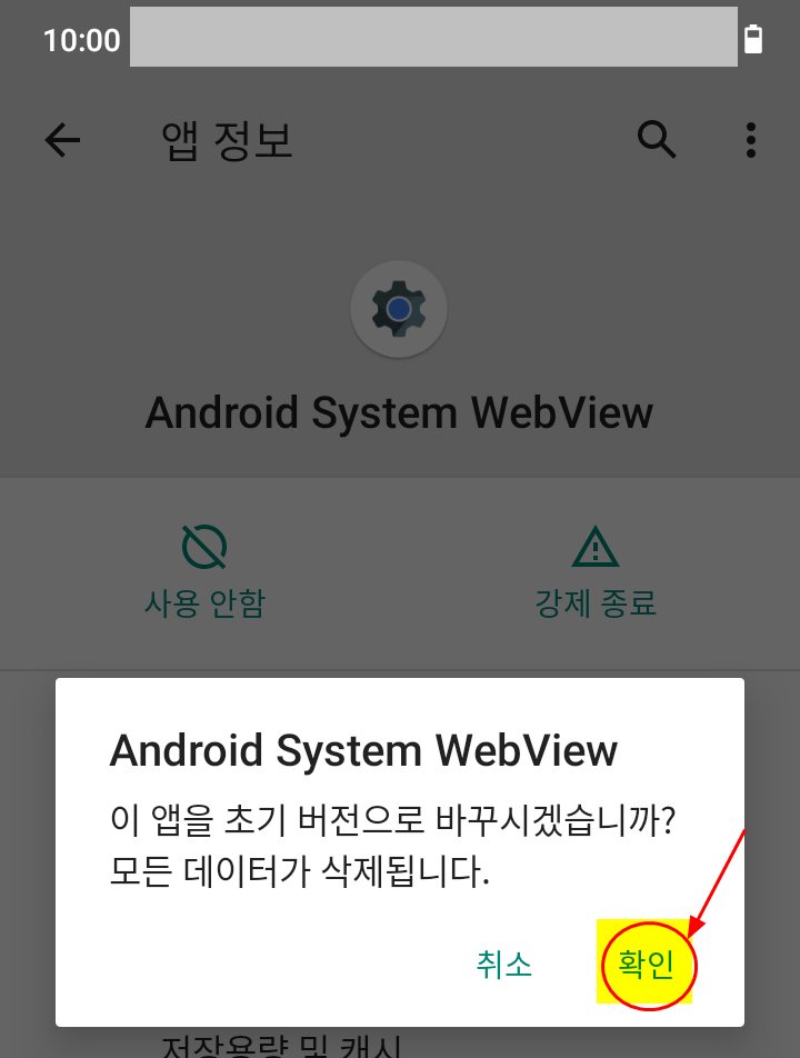 5. Android System WebView 이 앱을 초기 버전으로 바꾸시겠습니까? 모든 데이터가 삭제됩니다.