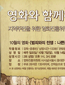 영화46 영화진흥위원회 주말 한국영화 무료상영회 : 4월의 영화 <그대를 사랑합니다> 4월 영화진흥위원회(영진위)의 주말 한국영화 무료상영회 소식을 전해 드린다. 4월의 영화는 이순재, 윤소정, 송재호, 김수미 주연의 '그대를 사랑합니다'이다. 똘82닷컴(www.ttol82.com)은 아직 이 영화를 보지 못했다. 하지만 네이버 평점으로 미루어 보아 대단히 높은 점수의 영화이다. 똘82닷컴이 몰라서 그런지 모르지만, 나름 괜찮은 영화로 보인다. 한번 찾아서 봐야 겠다. 영진위의 무료영화 상영회는 4월 매주 일요일에 상영을 하며, 좌석은 135석이며, 선착순 입장이라고 하니 서두르셔야 할 것 같다. 일요일 2회 상영(13시, 15시 30분)이니 시간을 잘 맞추시기 바란다. 서울 영화진흥위원회 시사실(서울시 동대문구 청량리동 206-26)에서 이루어지니까 근처에 사시는 분들이 보기에는 괜찮을.. 2013. 4. 4. 영화진흥위원회 주말 한국영화 무료상영회 : 3월의 영화 '늑대소년' 3월 영화진흥위원회(영진위)의 주말 한국영화 무료상영회 소식을 전해 드린다. 좀 늦긴 했지만... 3월의 영화는 송중기, 박보영이 주연을 맡은 '늑대소년'이다. 똘82닷컴(www.ttol82.com)도 늑대소년을 봤다. 잔잔하게 재미가 있다. 늑대소년으로 인해서 송중기, 박보영 모두에게 한층 더 인기가 많아지지 않았나 싶다. 특히 박보영...ㅋㅋ 영진위의 무료영화 상영회는 3월 매주 일요일에 상영을 하며, 좌석은 135석이며, 선착순 입장이라고 하니 서두르셔야 할 것 같다. 일요일 2회 상영(13시, 15시 30분)이니 시간을 잘 맞추시기 바란다. 서울 영화진흥위원회 시사실(서울시 동대문구 청량리동 206-26)에서 이루어지니까 근처에 사시는 분들이 보기에는 괜찮을 것 같다. [ 영화진흥위원회 3월 주말.. 2013. 3. 16. 영화진흥위원회 주말 한국영화 무료상영회 : 11월의 영화 '부러진 화살' 날씨가 쌀쌀해 지고 있다. 어우~11월 영화진흥위원회(영진위)의 주말 한국영화 무료상영회 소식을 전해 드린다.11월의 영화는 안성기, 박원상 등이 펼치는 '부러진 화살'이다. 똘82닷컴(www.ttol82.com)도 부러진 화살을 봤는데, 재밌다. 실화를 바탕으로 했기에 좀 더 흥미진진한 것이 아닐까?최근에 그것이 알고 싶다에서도 한번 방송이 된 적도 있는데, 결말은...ㅋㅋ 암튼 안타깝다.영진위의 무료영화 상영회는 11월 매주 일요일에 상영을 하며, 좌석은 135석이며, 선착순 입장이라고 하니 서두르셔야 할 것 같다. 일요일 2회 상영이니 시간을 잘 맞추시기 바란다.서울 영화진흥위원회 시사실(서울시 동대문구 청량리동 206-26)에서 이루어지니까 근처에 사시는 분들이 보기에는 괜찮을 것 같다.[ 영화진.. 2012. 11. 2. 영화진흥위원회 주말 한국영화 무료상영회 : 10월의 영화 '범죄와의 전쟁' 10월 영화진흥위원회(영진위)의 주말 한국영화 무료상영회 소식을 전해 드린다.10월의 영화는 최민식, 하정우가 펼치는 '범죄와의 전쟁:나쁜놈들 전성시대'이다. 똘82닷컴(www.ttol82.com)도 범죄와의 전쟁을 봤는데, 참 재밌게 봤다. 간만에 제대로 연기력이 살아있는(^^) 한국영화가 아닐까 싶다.영진위의 무료영화 상영회는 10월 매주 일요일에 상영을 하며, 좌석은 135석이며, 선착순 입장이라고 하니 서두르셔야 할 것 같다. 일요일 2회 상영이니 시간을 잘 맞추시기 바란다.서울 영화진흥위원회 시사실(서울시 동대문구 청량리동 206-26)에서 이루어지니까 근처에 사시는 분들이 보기에는 괜찮을 것 같다.단, 이번 영화는 18세이상 관람가이기에 청소년들은 입장이 불가할 것이다.[ 영화진흥위원회 10월.. 2012. 10. 5. 영화진흥위원회 주말 한국영화 무료상영회 : 7월의 영화 <해운대> 영화진흥위원회(영진위)의 7월 주말 한국영화 무료상영회 소식이 나왔다.7월의 영화는 설경구와 하지원, 박중훈 등 주연의 해운대이다. 여름이라서 그런가 날씨에 맞는 영화를 상영해 준다.전까지는 대부분 최신의 영화를 보여 주었는데...똘82닷컴은 해운대를 직접 보지는 않았고, 시사회 겸 미메이킹 된 필름으로 감상을 한 적이 있어서 생각이 난다.제대로 cg처리가 안 된 상태에서 보았는데, 조금 엉성한 감이 있었다. ㅋㅋ 그 당시에는 인기가 크지 않을 줄 알았는데... 의외로 대박 관람객을 끌어들였다. 영화 평은 나름 모르겠다.. 알아서 판단을 하시길...7월 매주 일요일에 상영을 하며, 좌석은 135석이며, 선착순 입장이라고 하니 서두르셔야... 서울 영화진흥위원회 시사실(서울시 동대문구 청량리동 206-26.. 2012. 7. 5. 한성백제 금요시네마 7월 무료영화 - 매주 금요일 오후6시30분 한성백제 금요시네마 7월 상영작을 소개한다. 한성백제 금요시네마는 서울올림픽 공원 내 한성백제박물관에서 주최를 하는 문화행사이다. 몽촌역사관과 근처에 있지만, 조금 성격은 다르다. 몽촌역사관은 어린이를 대상으로 이루어지는 반면, 한성백제박물관은 모든 연령층을 대상으로 관람이 가능하다. 7월의 주제는 '영화과 탐정'으로 쏠트, 명탐정 코난-칠흑의 추적자, 조선명탐정-각시투구꽃의 비밀, 셜록홈즈를 상영해 준다. 컴퓨터로만 봤던 영화들이라면 맘편히 무료로 좀 더 큰 스크린에서 느껴보자. 300여석의 자리가 있고, 선착순 입장이기에 서둘러서 한번 관람하러 가 보