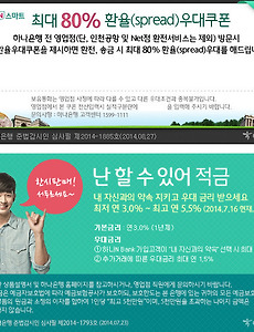 하나은행 80% 환율우대쿠폰 - 2014년 12월 31일까지 스탠다드차타드은행의 80%환율우대쿠폰에 이어 하나은행도 2014년 12월 31일까지 80% 환율우대쿠폰을 주고 있다. 별도의 하나은행 통장 고객이 아니라도 가능하기에 좋다. 그래도 하나은행 입출금 통장이라도 있으면 바로 환전을 해서 통장에 입금해 버리면 편리하기 때문에 좋을 듯 하다. [ 80% 환율우대쿠폰 - 출처 : 하나은행 ] [ 하나은행 80% 환율우대쿠폰 받기 바로가기 ] 대상영업점 : 하나은행 전 영업점(단, 인천공항 및 Net점 환전서비스는 제외) 대상통화 : 미국달러, 유로화, 일본엔화(기타통화 50% 우대, 해외송금은 모든 통화 60% 우대) 대상거래 : 외화현찰 사고 팔때, 해외로의 당발송금시 미화 200불이상 거래시에만 우대제공 유효기간 : 2014년 12월 31일까지 괜찮은 조건이다.. 2014. 9. 7.